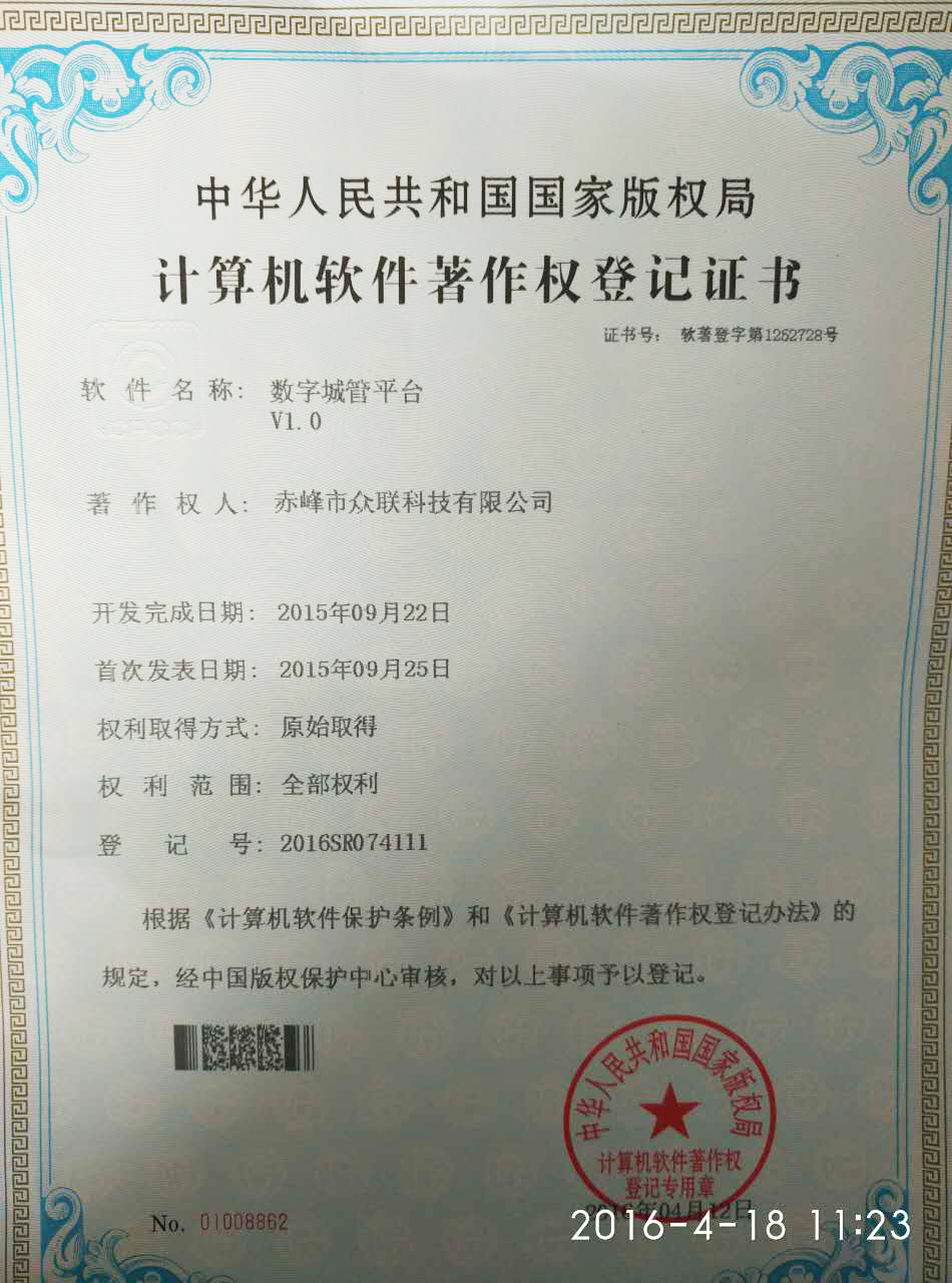 恭賀赤峰市眾聯(lián)科技有限公司通過大家的齊心協(xié)作,取得了“數(shù)字城管平臺(tái)”的軟件著作權(quán)!
